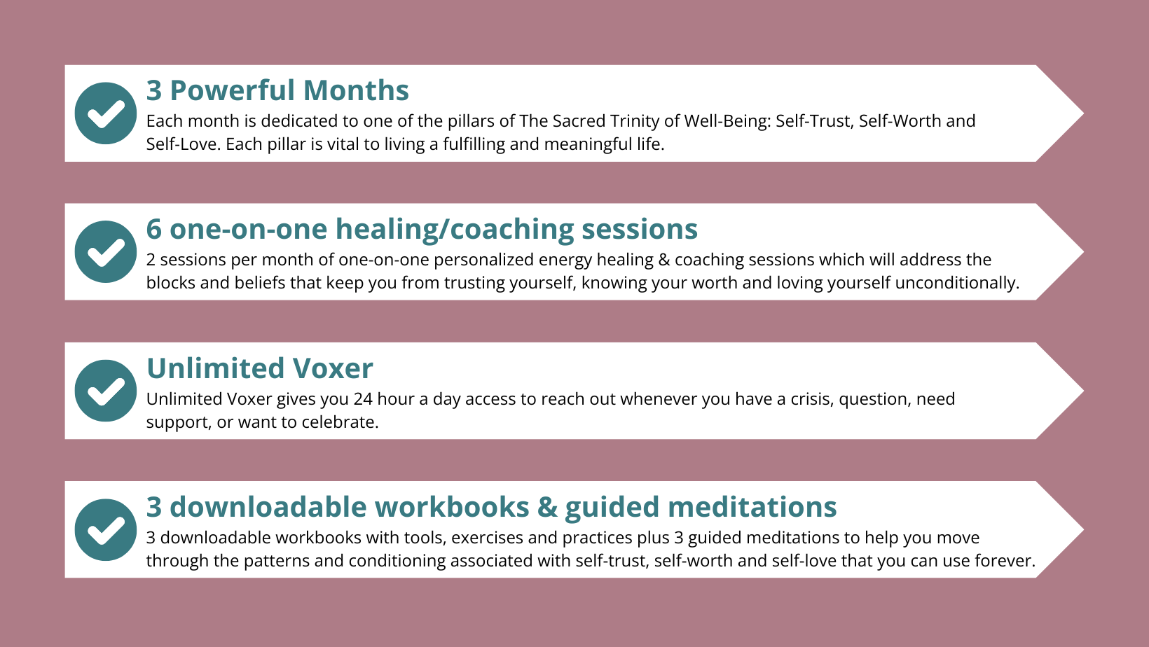 Twice a month we will meet in-person or on Zoom. Each month these sessions will focus on one pillar of the trinity of well-being and will include discussion about your self-discoveries through the workbook and guided meditation followed by coaching, channeled guidance and/or energy healing. Each session will be unique to you and what is best for you in the moment. You will also have unlimited Voxer access, you will be able to send messages and receive guidance anytime in between your sessions to address any resistance coming up or “homework” you’ve been given.